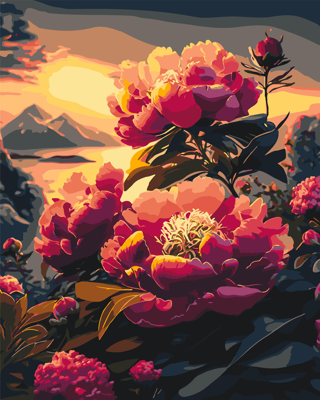 Картина за номерами Квіти "Півонії на тлі гір" зроблена з якісних матеріалів і прекрасно підійде як подарунок для дітей і дорослих шанувальників рукоділля та творчості. Після завершення роботи ви зможете повісити картину на стіну як прикрасу для вашого будинку.